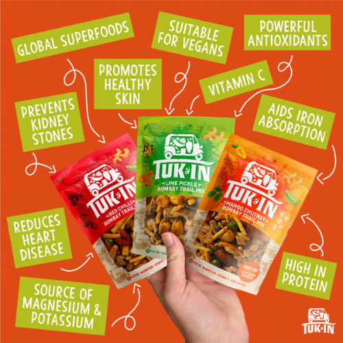- Stand Out Shelf Appeal: Tuk-In’s recognisable and standout branding makes it an eye-catching choice for consumers seeking an authentic Indian snack.